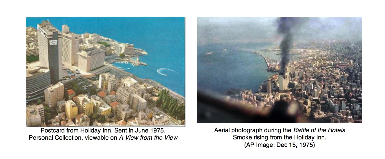 This paper is centered on the growth of Beirut’s Hotel District (Minet Al Hussein, Zeitouna, Ayn al Mressei), which was marked by a hopscotching of infrastructural developments realized through sites of commercialized hospitality in various eras. There are three steps in the above postcard from 1976: The Holiday Inn is prominently foregrounded; facing it are the two towers of the then 15-year-old Phoenicia Hotel; and at sea’s edge, the Saint George Hotel from 1932. These three structures, like stepping stones of greater height, offerings of pleasures, and circulations of bodies, map over periods in the development of Beirut: the French Mandate (1923), after Lebanese Independence (1946), and the start of the Lebanese Civil War (1975). This paper explores aspects of each hotel, a stone’s throw away in distance, but decades apart in time. I argue that these hotels were where hopes and expectations were housed in real concrete infrastructures, but supported through vicarious beams built through tourism. As Harman notes of a bomb: “corrosive chemicals lie side by side” and “something must happen on the sensual plane to allow them to make contact” (2013: 197). In connecting two objects, “separated by a thin film eaten away over time, or ruptured by distance signals” an ensuing reaction results in something new beyond the two (ibid). How then were hotels vicarious mediators in this one area, between guests and the urban landscape? Between multiple visions of Lebanon’s future?